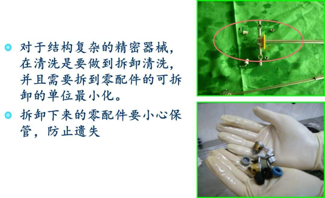 機(jī)器清洗并不能全部代替手工清洗,對(duì)于某些管道、精密儀器和較難清洗部位必須手工清洗,此外對(duì)于清洗設(shè)備必須經(jīng)常清洗和保養(yǎng)以免機(jī)器清洗失效。